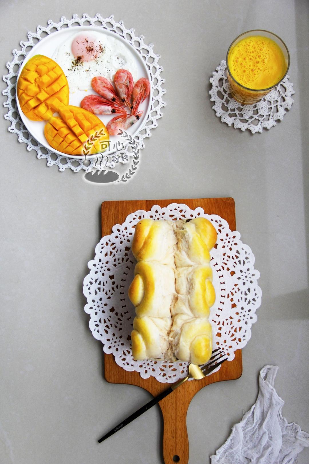 [调皮]今天的早餐:南瓜葡萄干吐司,芒果,鸡蛋,冰虾,南瓜米糊。