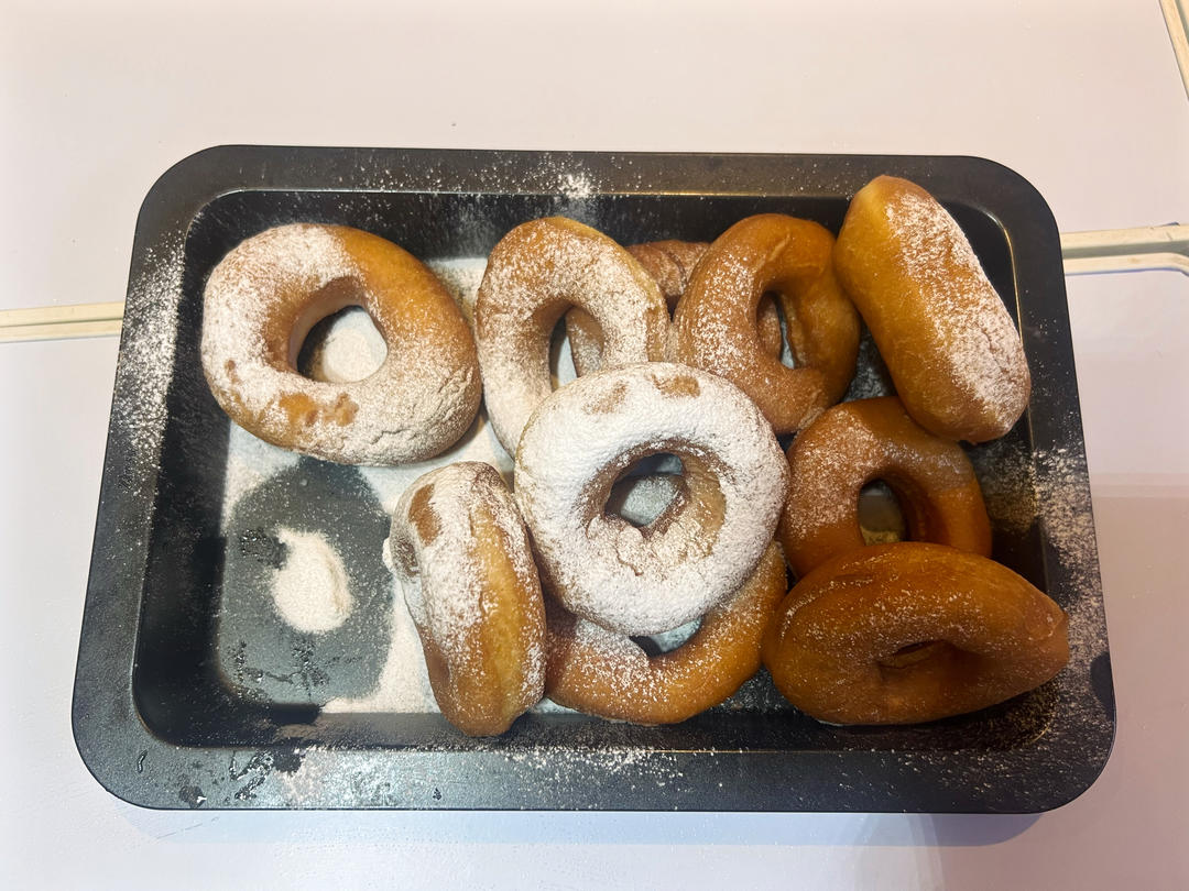 甜甜圈自我感觉有点失败,发酵不够好、整形不完美,但是孩子们特别买账,用光盘行动和夸奖来给我自信心