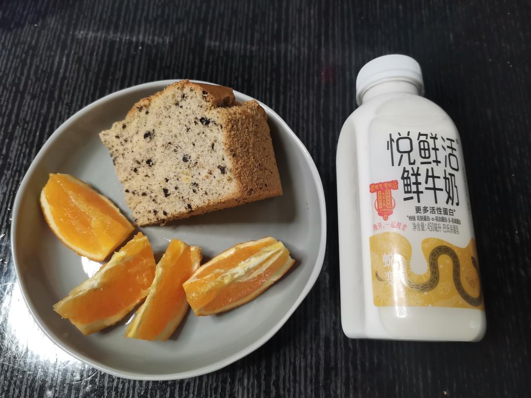 生活,无时无刻提醒着我们,要珍惜当下,早安!今日早餐打卡:奥利奥戚风蛋糕,橙子,鲜牛奶
