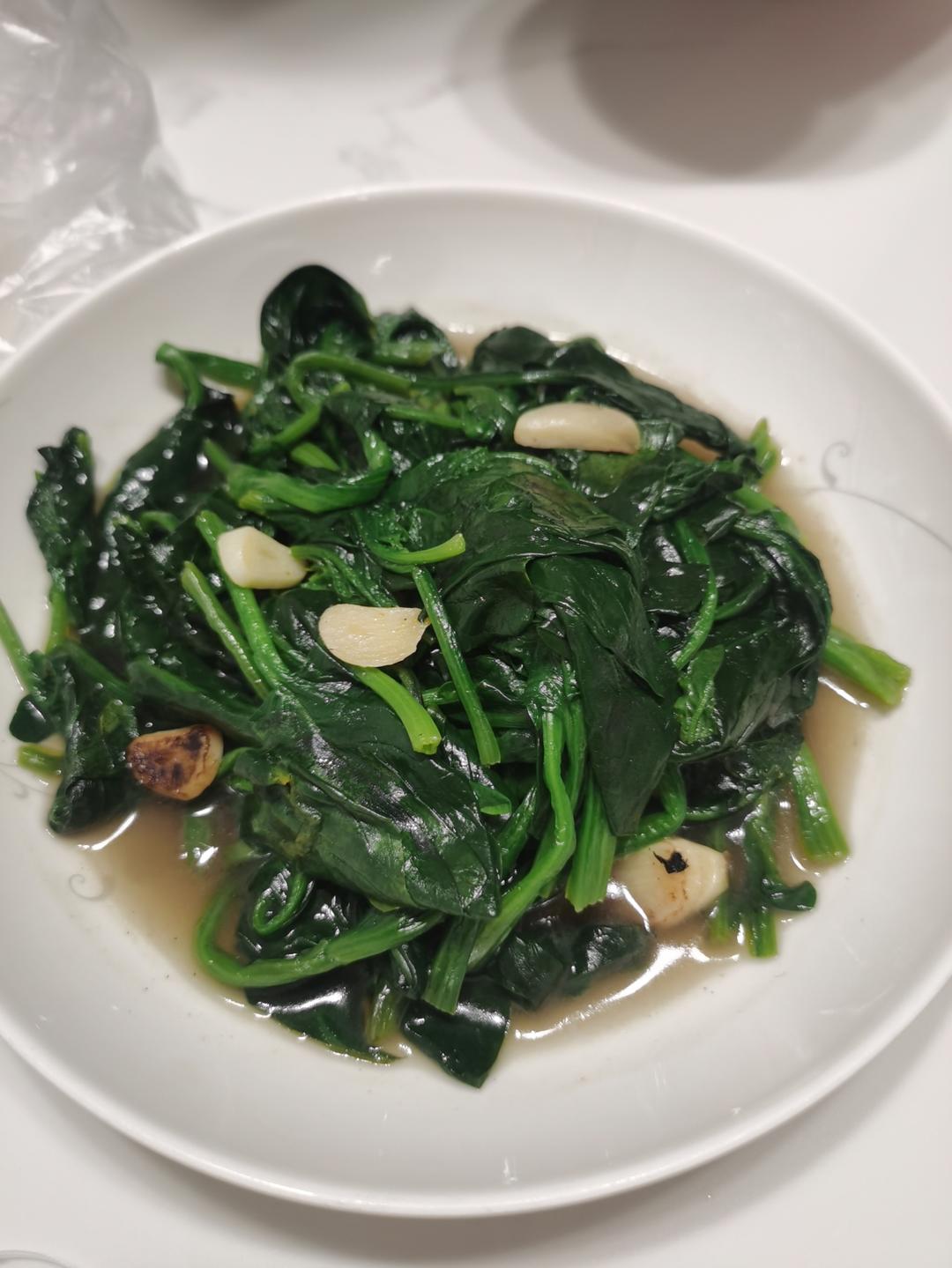 正月初十。冰箱的乱七八糟炒法。菠菜太老了,好难吃。烧烤剩的鲜鱿头也做了道菜。还可以。