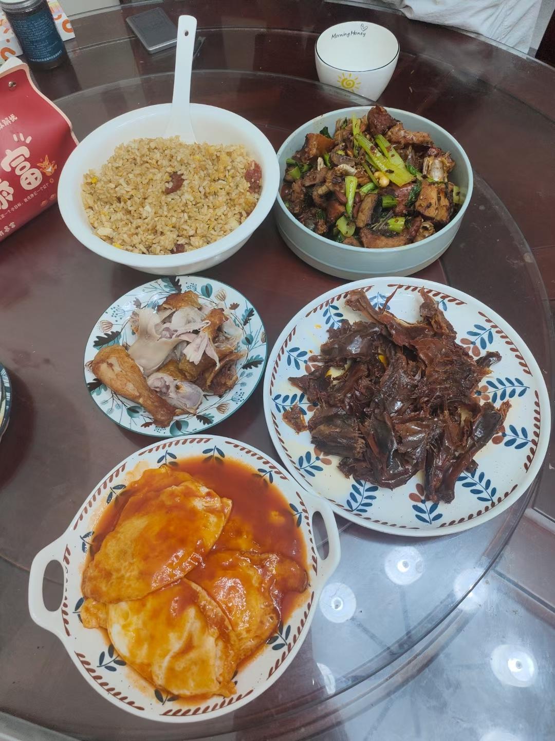 腊鱼,板鸭,炸鸡,番茄蛋,炒饭