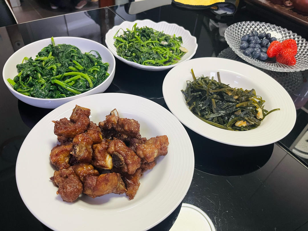 蒜香排骨,炒海带,清炒茼蒿跟西蓝花