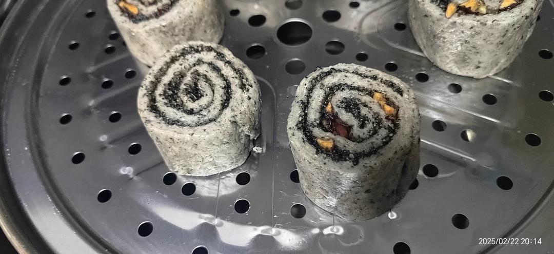 只加了猪油 然后发酵天气太冷了 一个晚上放厨房没反应 第二天只加了白糖发酵 有效果 。再继续揉小块,加芝麻红枣 核桃 搞成卷 感觉有水 芝麻卷大小不均匀 冷水上锅十分钟后开始中火,5分钟后揭盖。