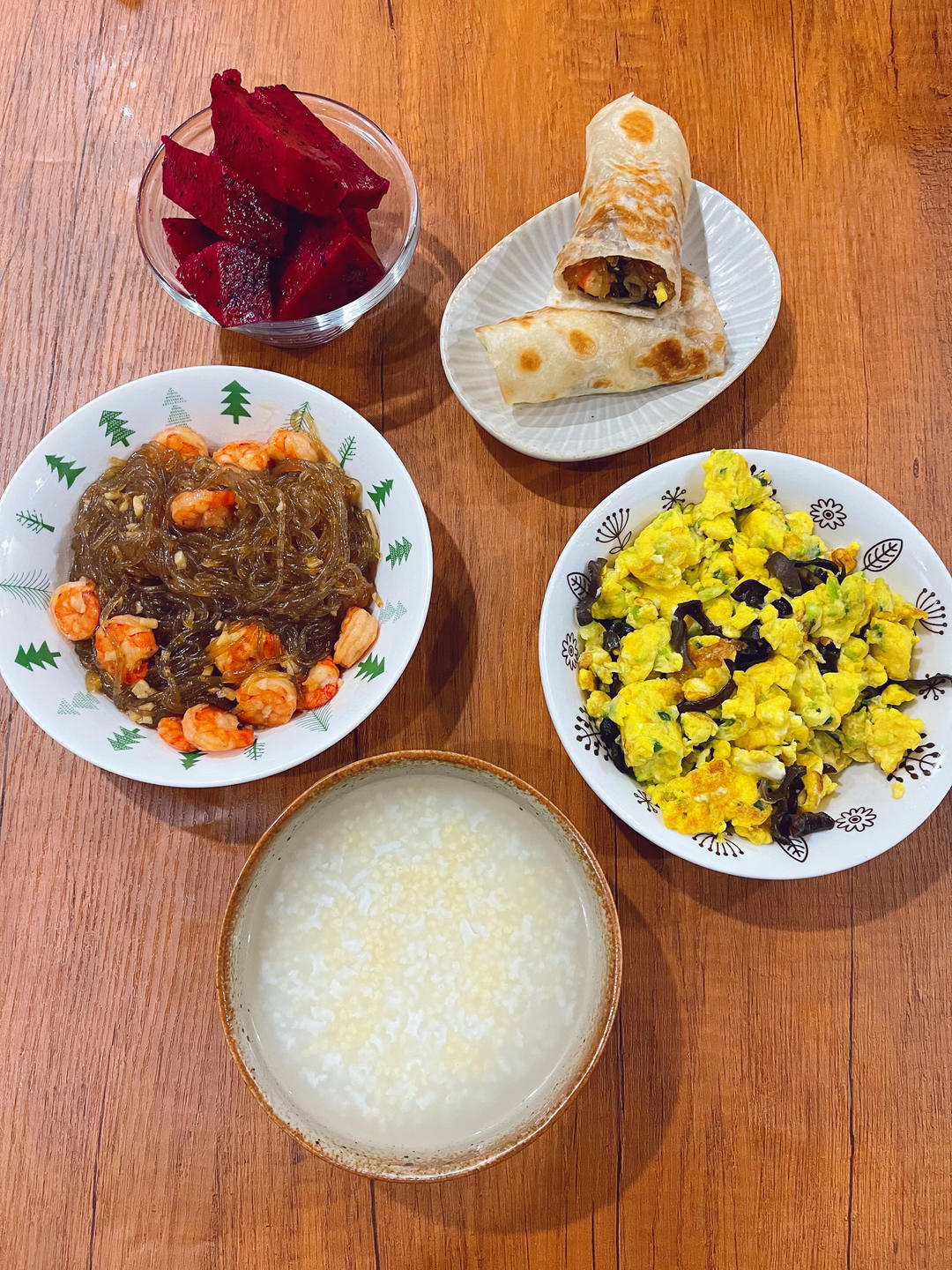 二米粥,西葫芦鸡蛋,虾仁粉丝,卷饼