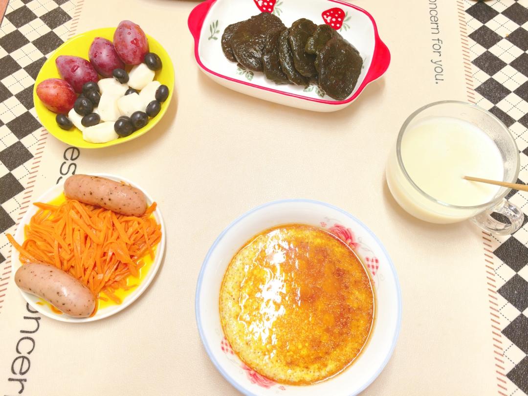 今日早餐:蒿子粑粑➕水蒸蛋➕烤肠➕➕胡萝卜丝➕混合水果