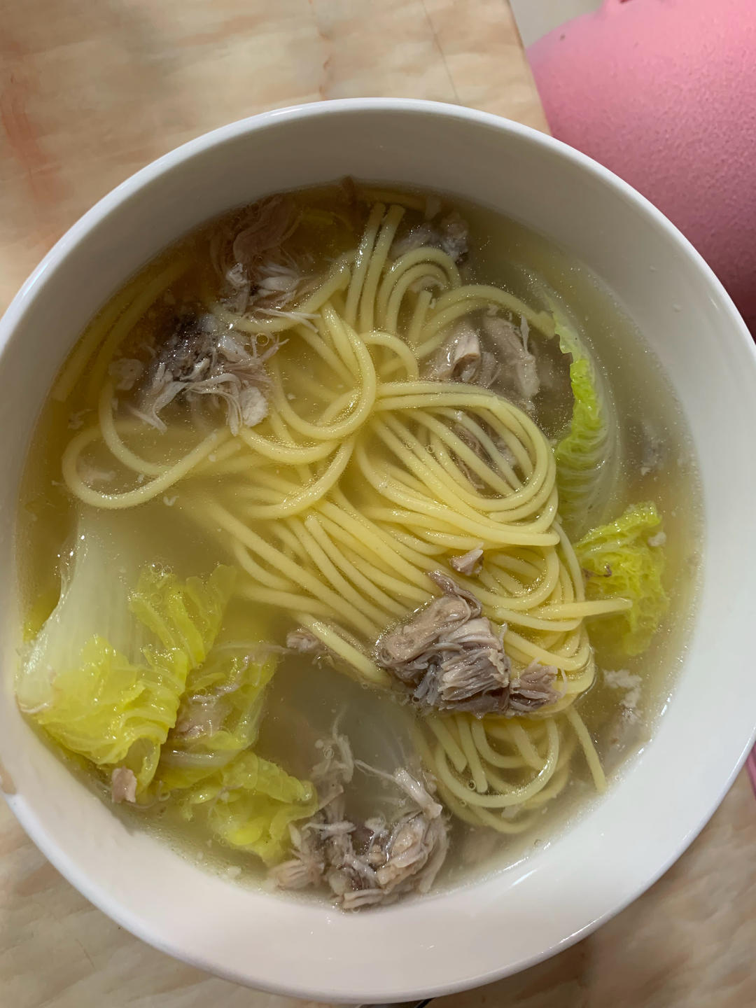 排骨汤娃娃菜玉米面条,面筋斗,汤浓郁