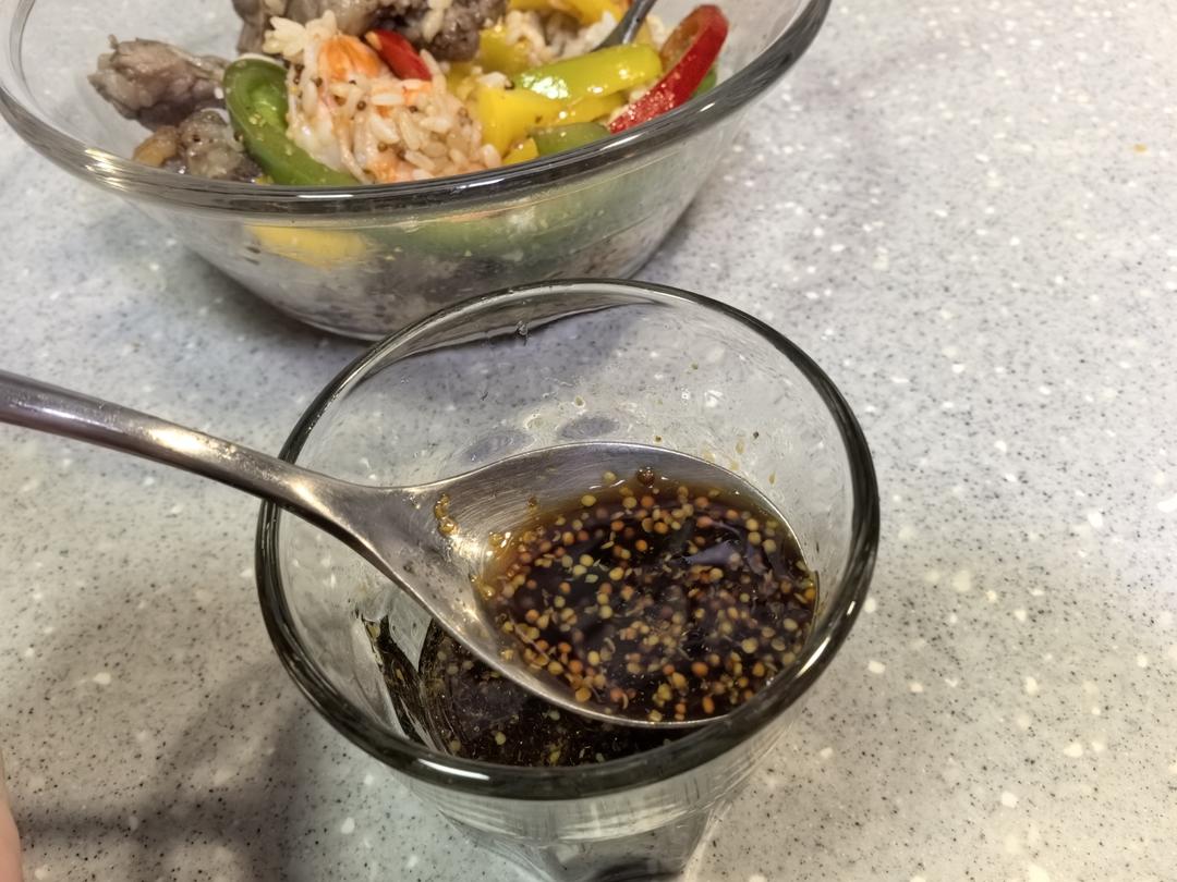 拌饭酱汁:一勺橄榄油+一勺生抽+一勺苹果醋+一勺蜂蜜+适量黄芥末籽酱,拌匀后适量添加。