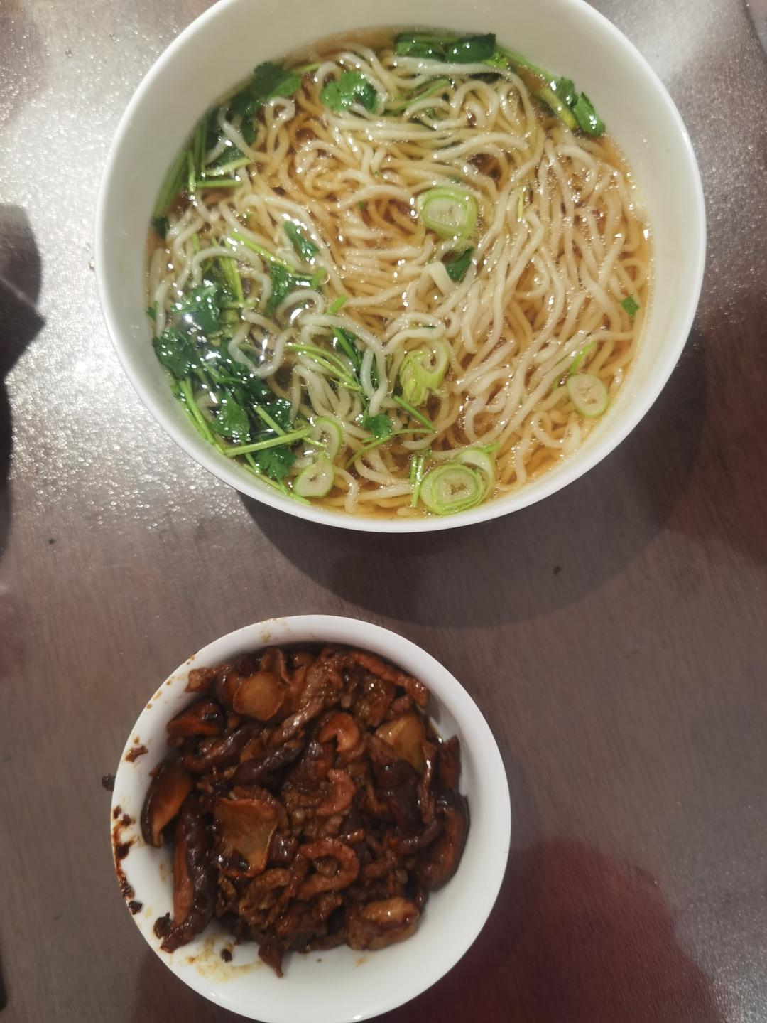 lncyryy 做过 2025年03月14日 香菇肉丝臊子面肉丝放面粉生抽老抽耗油胡椒粉腌制十分钟香菇切丝,下锅炒,再放肉丝炒熟。大碗中放猪肉油葱花香菜盐鸡精酱油,开水。煮好的面放入碗中。炒熟的臊子放进面里。吃! 03-14