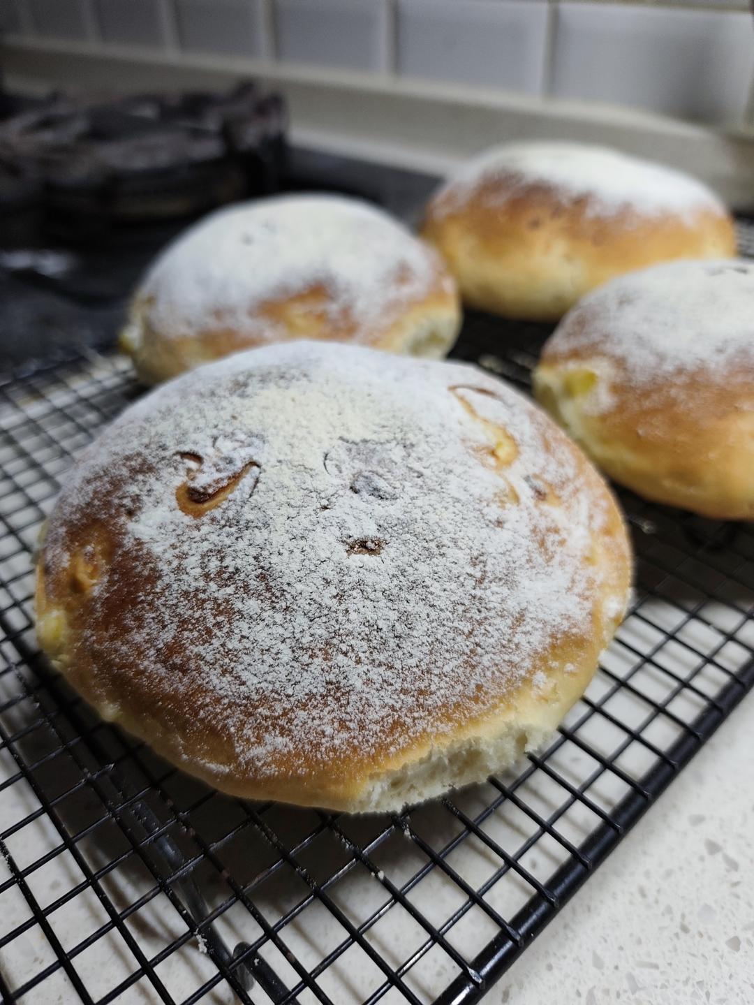 嘟嘟家小饭桌 做过 2025年03月17日 随手做的土豆面包。140g牛奶。190g土豆泥。5-6g干酵母。45g油。15g糖。6g盐+300g高筋面粉。全部混合在一起。轻揉成团。放置30分钟。一些手粉。分团。稍微整形。就可以发酵了。发酵合适就可以撒一些面上的粉。加热水盘。上火200度。下火230度。前后一共40分钟。在30分钟的时候把水盘移出来。再继续烤。就ok啦。 03-17