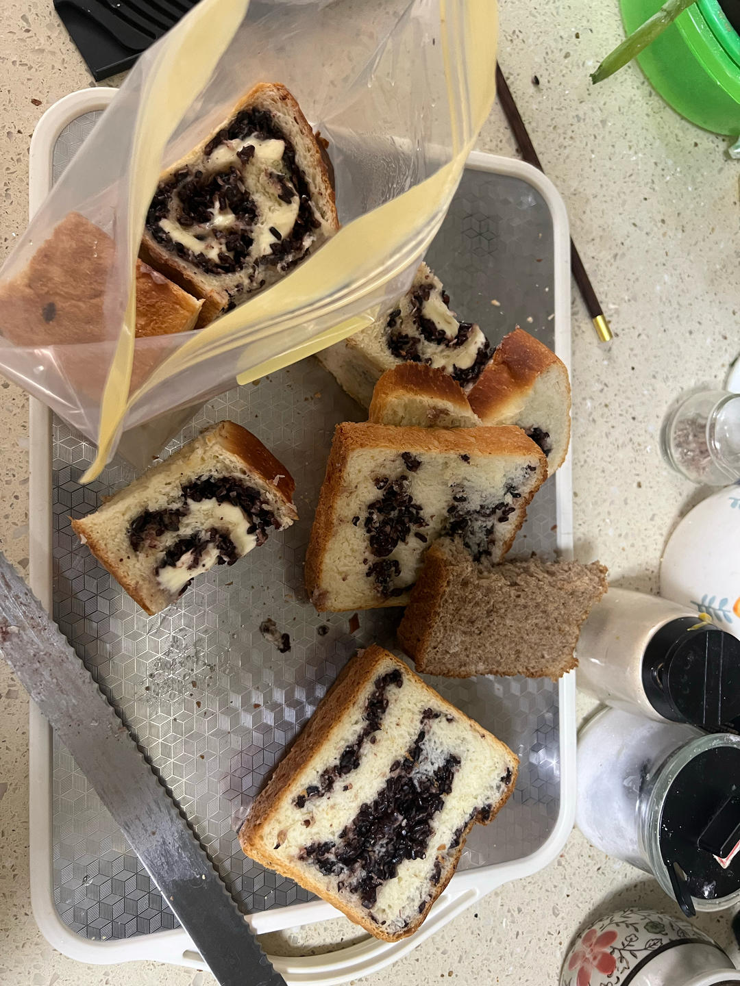 临时加了挺多紫米陷,吐司烘烤基本没长高。下次尝试下纯白吐司