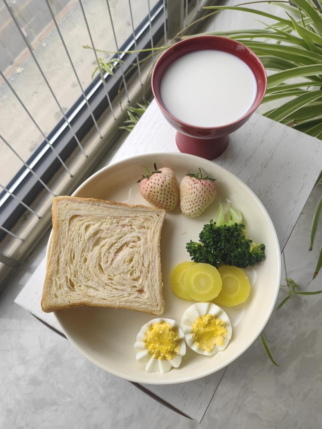 牛奶🥛+白桃吐司🍞+鸡蛋西兰花🥦+胡萝卜🥕+草莓🍓
