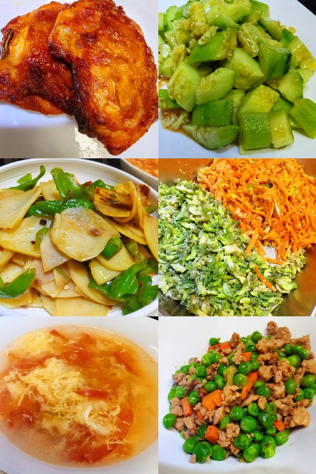 奥尔良烤翅拌黄瓜,青椒土豆片,蒸槐花胡萝卜丝,肉沫豌豆,西红柿蛋汤。给娃又配了个小汉堡。