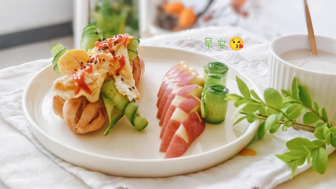 全麦面包、无油煎蛋、奶酪、黄瓜🥒、苹果🍎、蛋白粉🌹