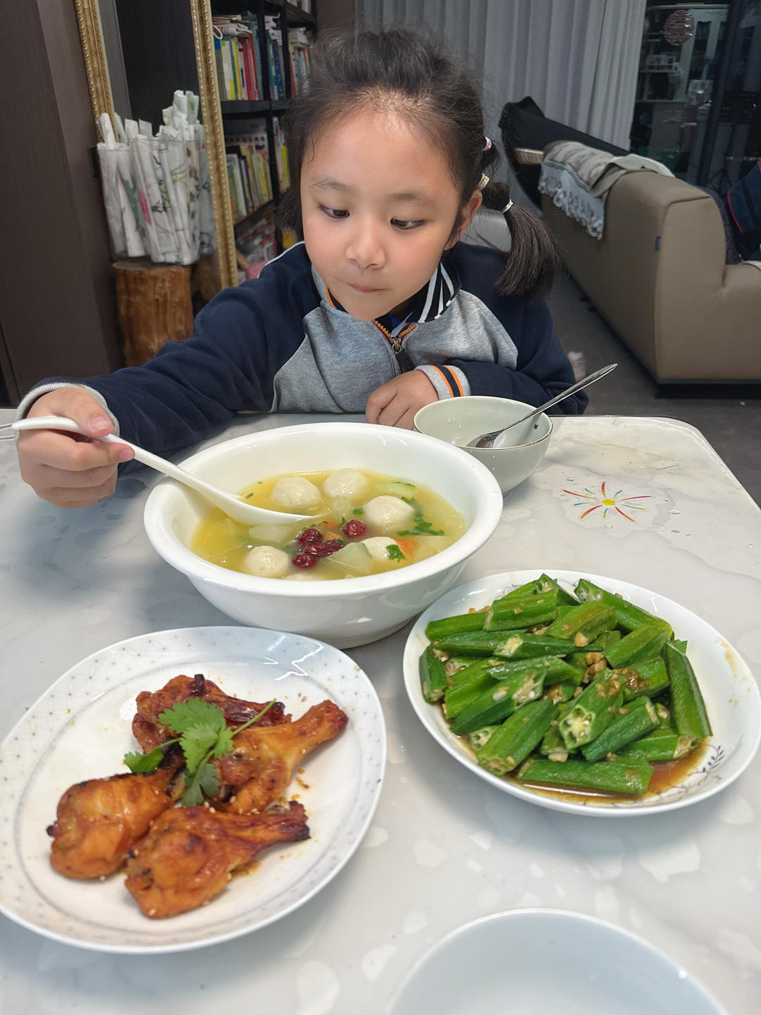 给宝贝做饭的第 5 天,好吃的飞起来,她很满意,鱼丸冬瓜汤,耗油秋葵,成品鸡腿香菜摆盘