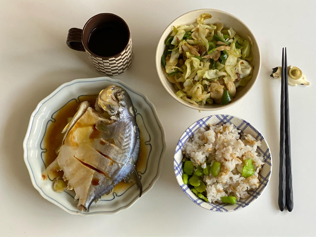 🈶:蒸金鲳鱼、蚕豆燕麦米&大米饭、炒杂蔬(卷心菜、杏鲍菇、青椒)