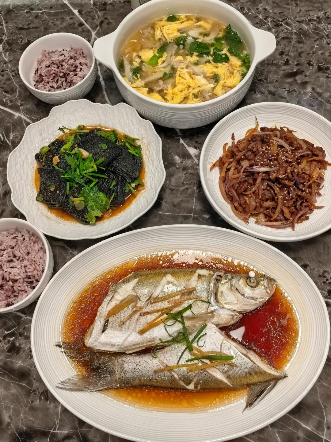 清蒸白丝鱼,洋葱炒牛肉,香菜臭豆腐,蘑菇青菜蛋花汤