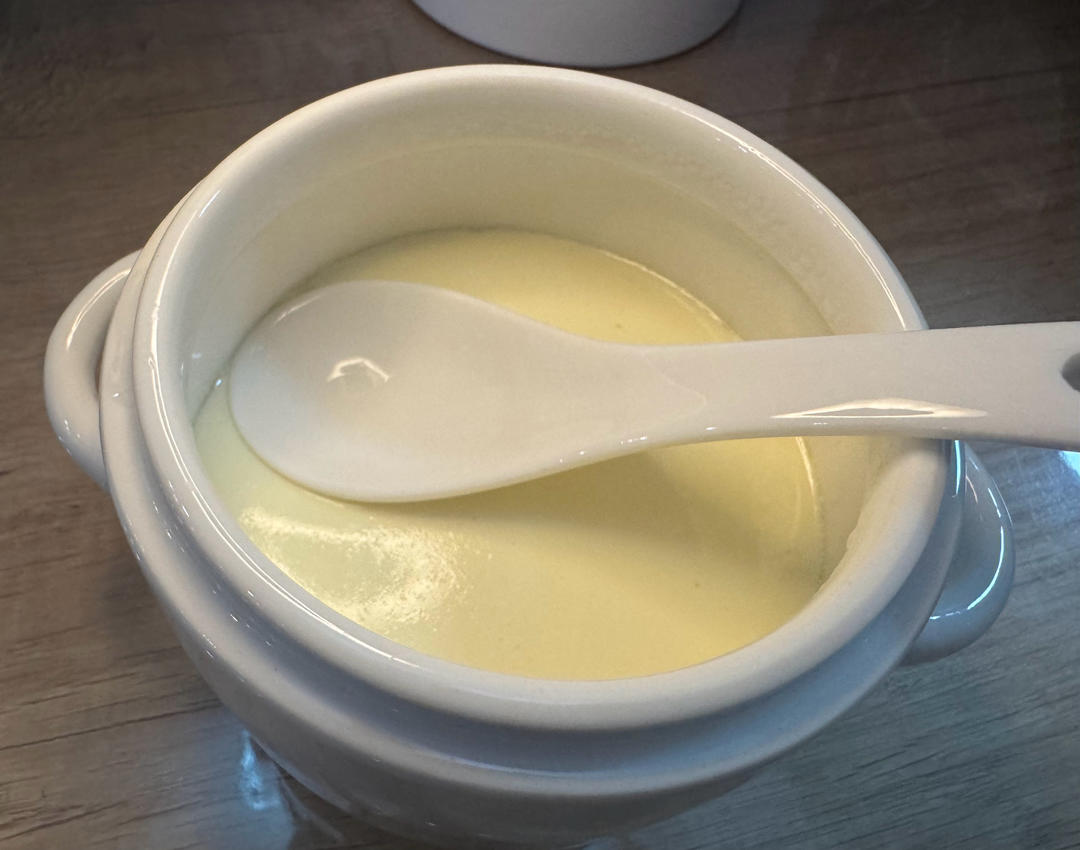 20克姜汁,250ml牛奶,25g奶粉倒了半袋,加了代糖,70度牛奶冲入姜汁,15分钟凝固状态。嫩的不要不要的了。
