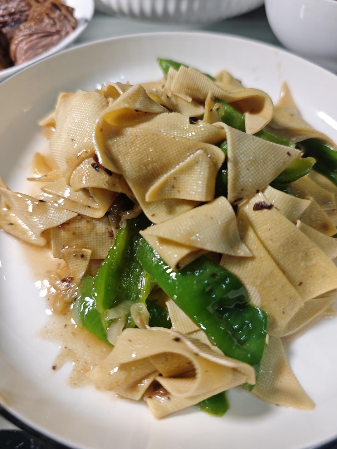 豆腐皮炒尖椒,豆豉油麦菜,西兰花炒虾仁,卤牛肉,韭黄炒肉