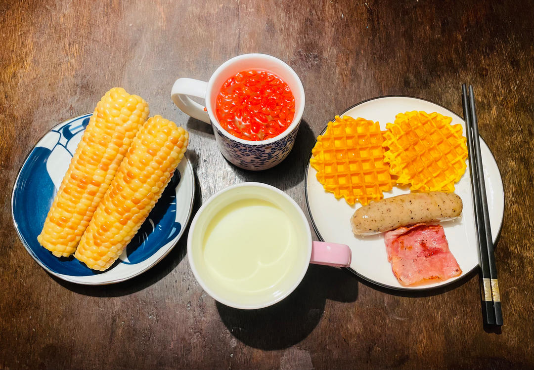 老公早餐:华夫饼、香肠、培根、玉米、羊奶和枸杞水。