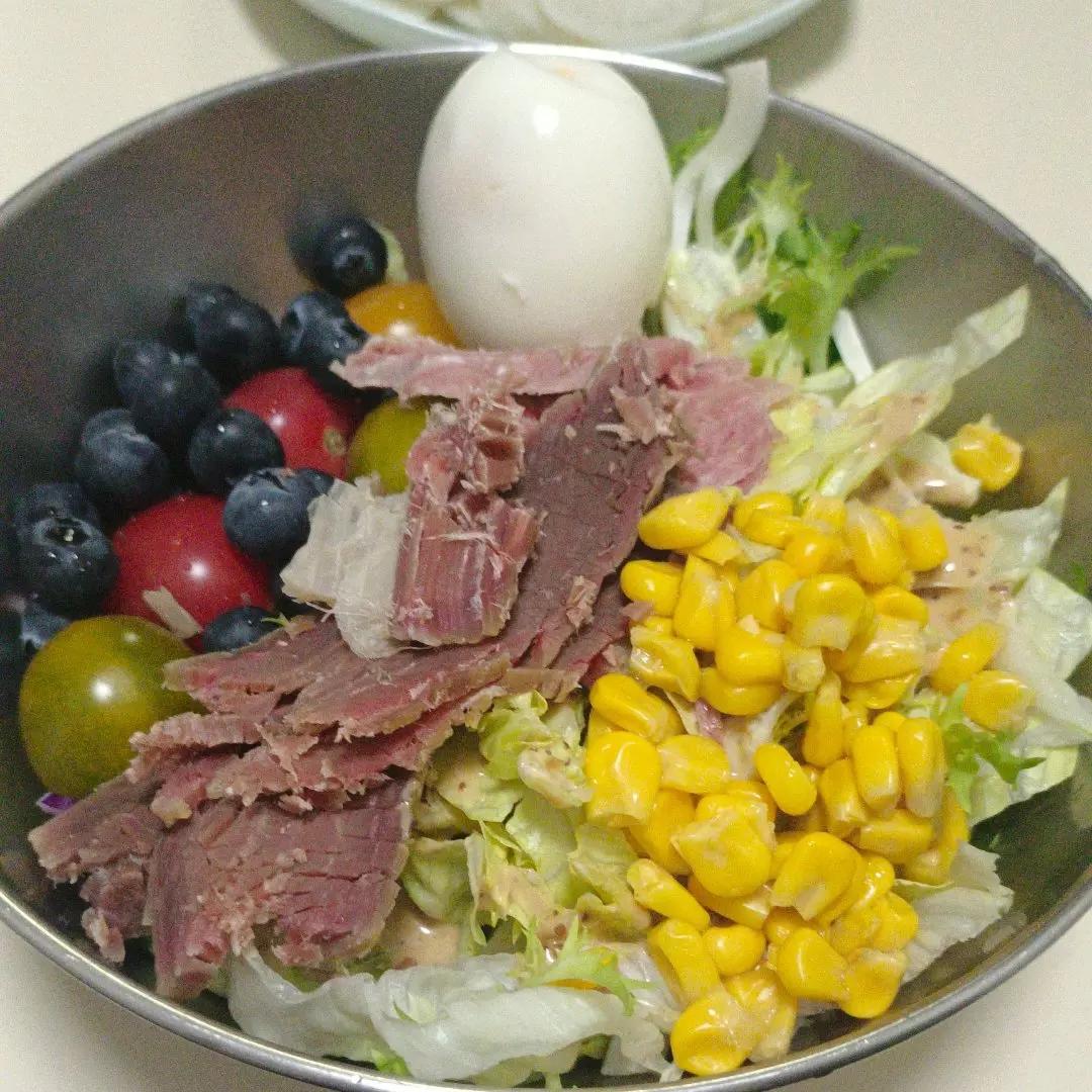 球生菜 紫甘蓝 黄瓜 苦菊 三色小番茄 鸡蛋 甜玉米粒 蓝莓 酱牛肉 腊牛肉 哈密冰糖薯
