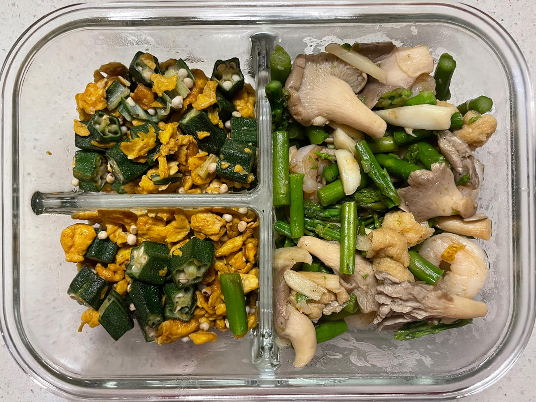 秋葵炒蛋+平菇芦笋油豆腐炒虾仁