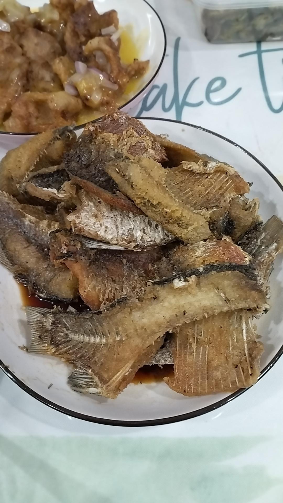 今天在家晚餐,香煎鲫鱼,老式锅包肉,荠菜牛肉羹,烤鸭红肠拼盘