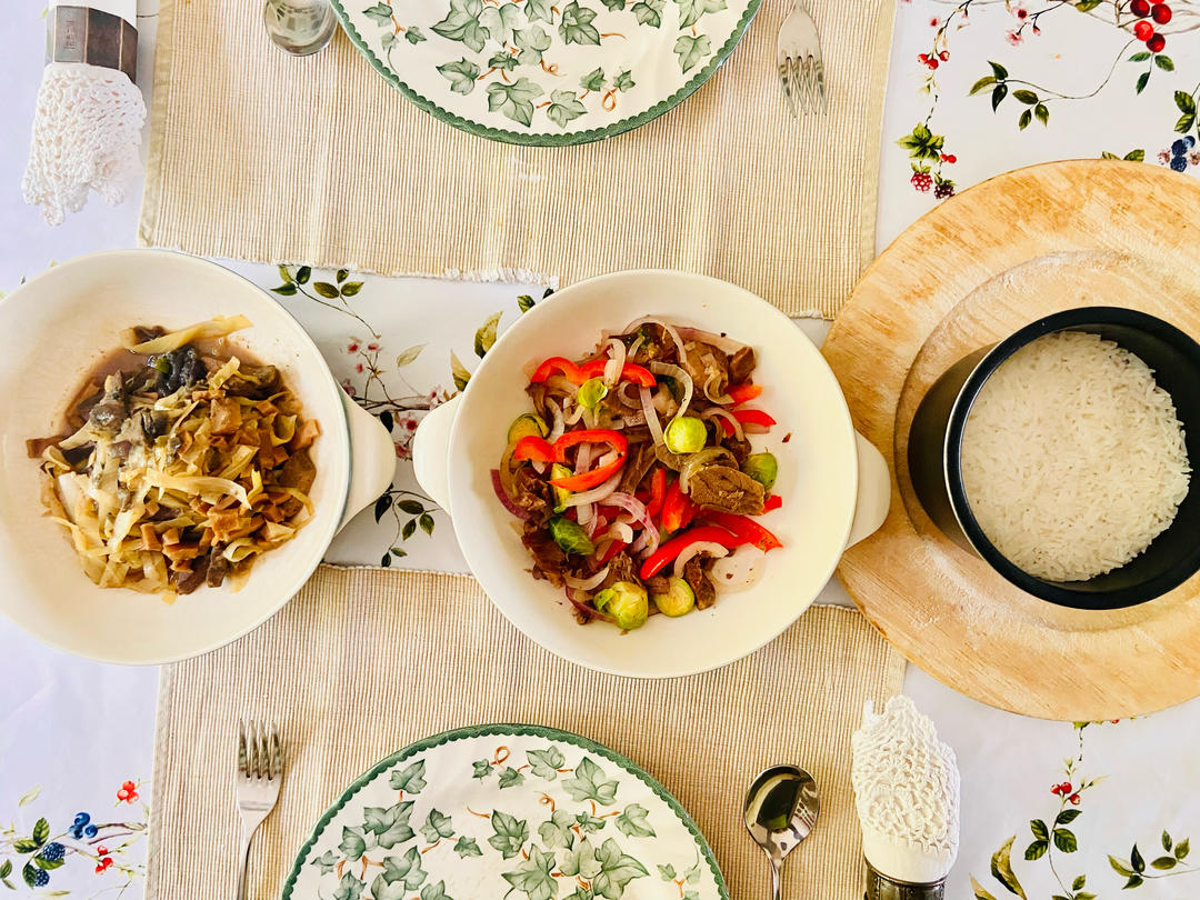 剩羊肉切片炒彩椒洋蔥和孢子甘藍,圓白菜絲雞湯筍丁燴剩豬肝。配上米飯,盤光。