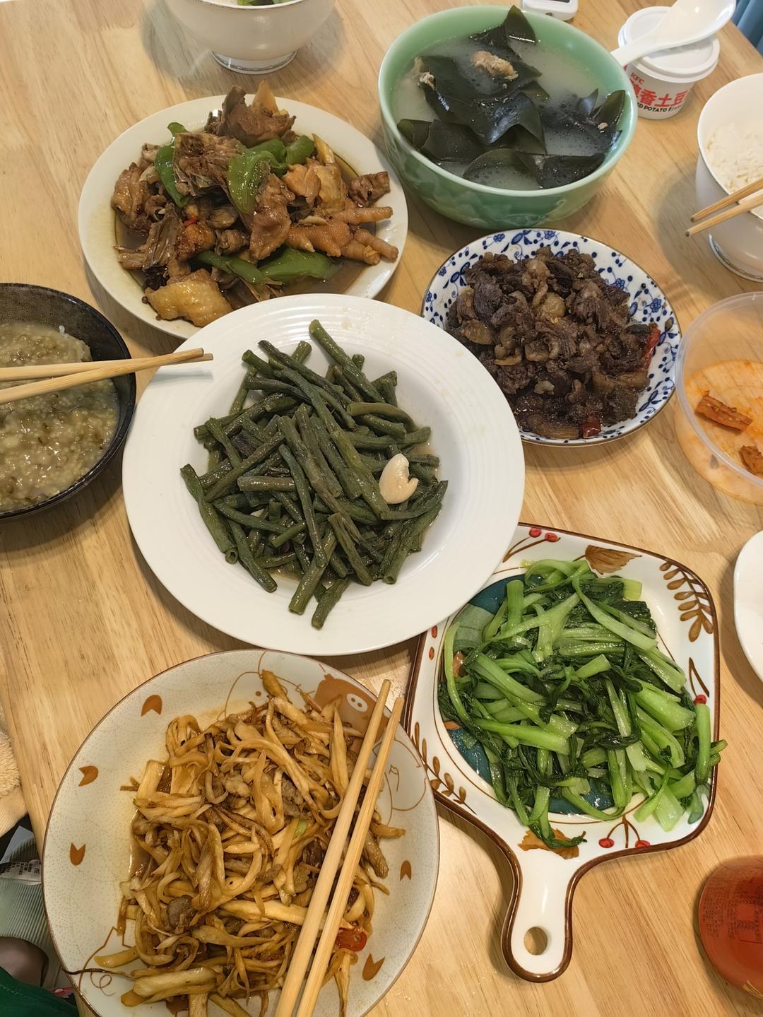 茭白肉丝,鸡毛菜,豇豆,羊肉,鸡,骨头汤