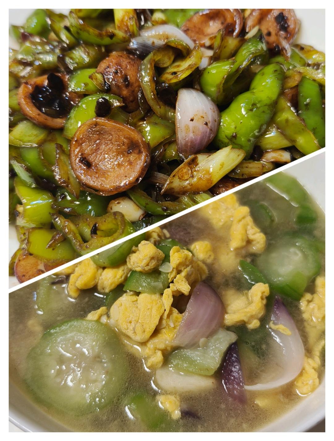 香肠豆豉椒圈,丝瓜蛋汤。提前准备好明天的早饭,牛马要有当牛马的觉悟😂