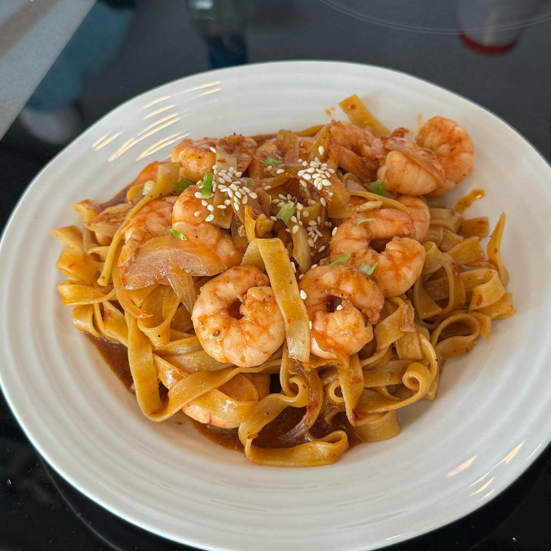 EllIE 做过 晚餐•2025年6月18日 #晚餐•2025年6月18日# 火锅虾意面🦐🌶️小成功!(不是大成功因为被1/3块底料咸/辣死了)虾加盐、料酒腌制备用;火锅牛油炒葱蒜洋葱,虾翻炒上色;加火锅底料翻炒均匀;放煮了八成熟的意面,加意面水、蚝油、白糖,翻炒均匀;出锅撒白芝麻 06-19