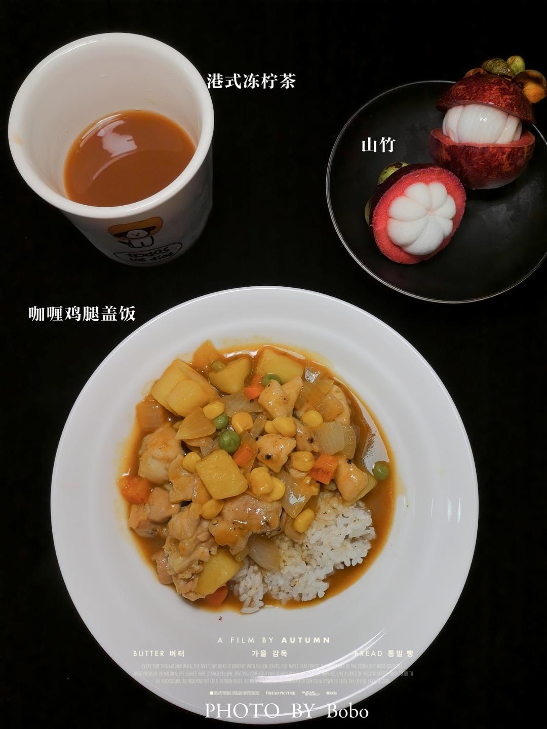 咖喱鸡腿盖饭🍛、港式冻柠茶、水果