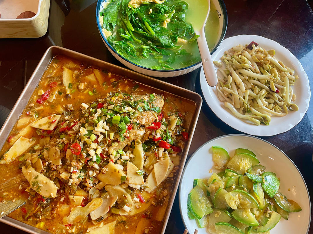 红烧鲤鱼,软江叶蛋汤 炒豆苗 炒南瓜