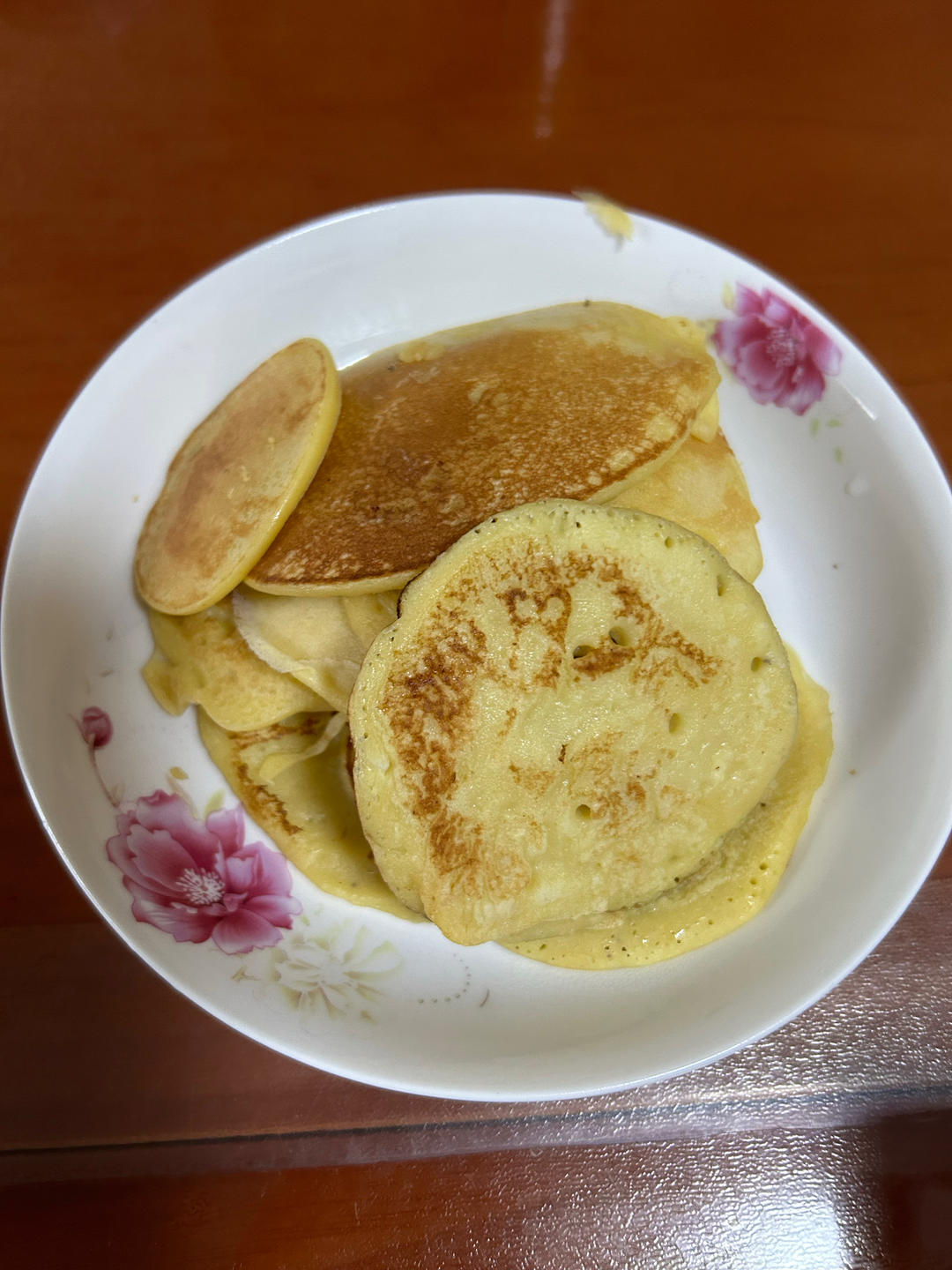 第一次没经验,面粉加多了,勺子太大,不好翻面。第一块火大焦了。
