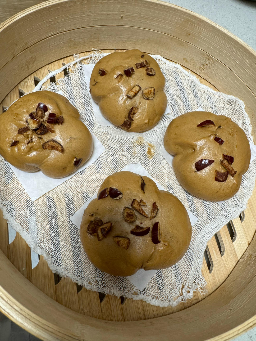 Bubee大大 做过 红糖开花馒头 #宵夜•2025年7月3日# 做的一发,水量130,直接厨师机揉好后再加了一点粉和红枣再揉,之后就是整形醒发,水光肌是有了,就是可能是冷水下锅的,没开花,不影响口感。 07-03