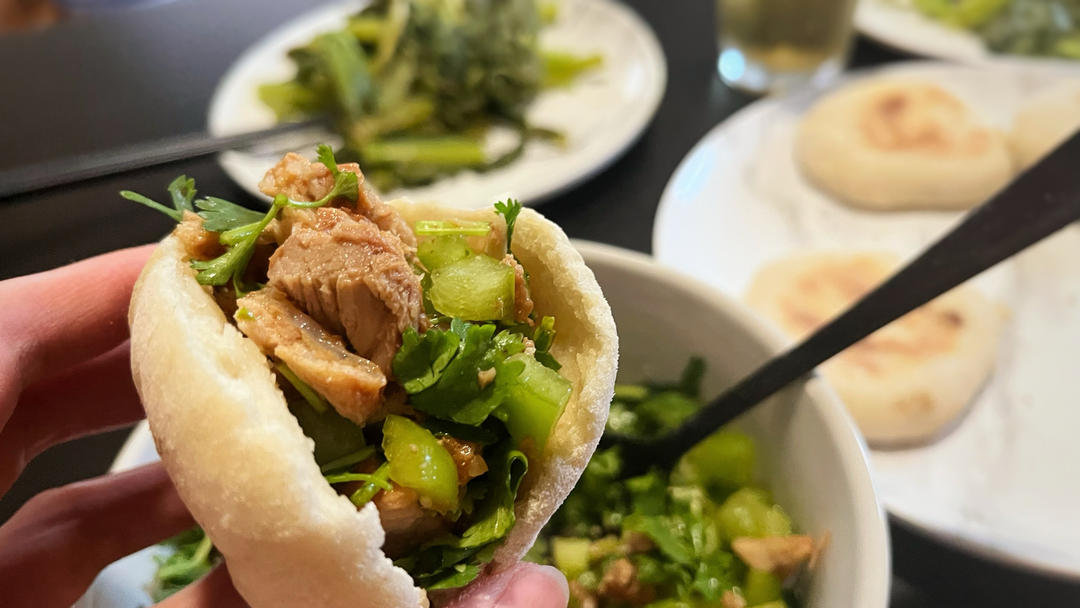 jeanneZ 做过 午餐•2025年7月4日 有人自从前一阵吃了我的肉夹馍chinese burger🤣就一直念叨。正好前两周做梅菜扣肉剩了不少五花肉边角料,再买点猪腿肉一起凑一顿。我俩居然吃了快两斤肉😂强制赠送每人一盘青菜#午餐•2025年7月4日# 07-05