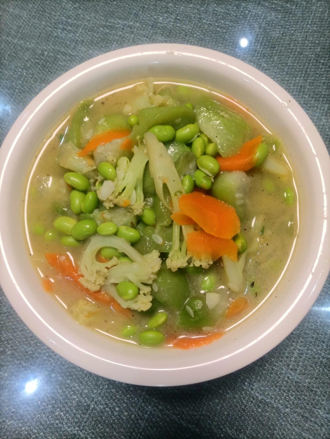 丝瓜花菜炒毛豆。