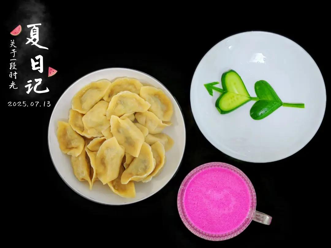 黄色素馅水饺,水果黄瓜,火龙果奶昔