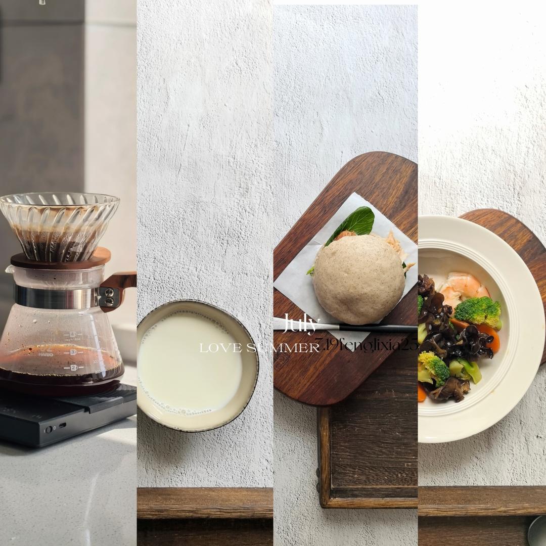 科研队长FLX 做过 2025年07月19日 7.19 周六,早☀️忽明忽暗阳光下的周末早午饭食光,敬美好。杂粮馒头加鸡腿肉,蒜末拌西兰花胡萝卜木耳水煮虾。豆奶一杯/手冲咖啡☕️咖啡香陪伴治愈的夏天。水果可做两个小时后加餐。——好好吃饭周末快乐! 07-19