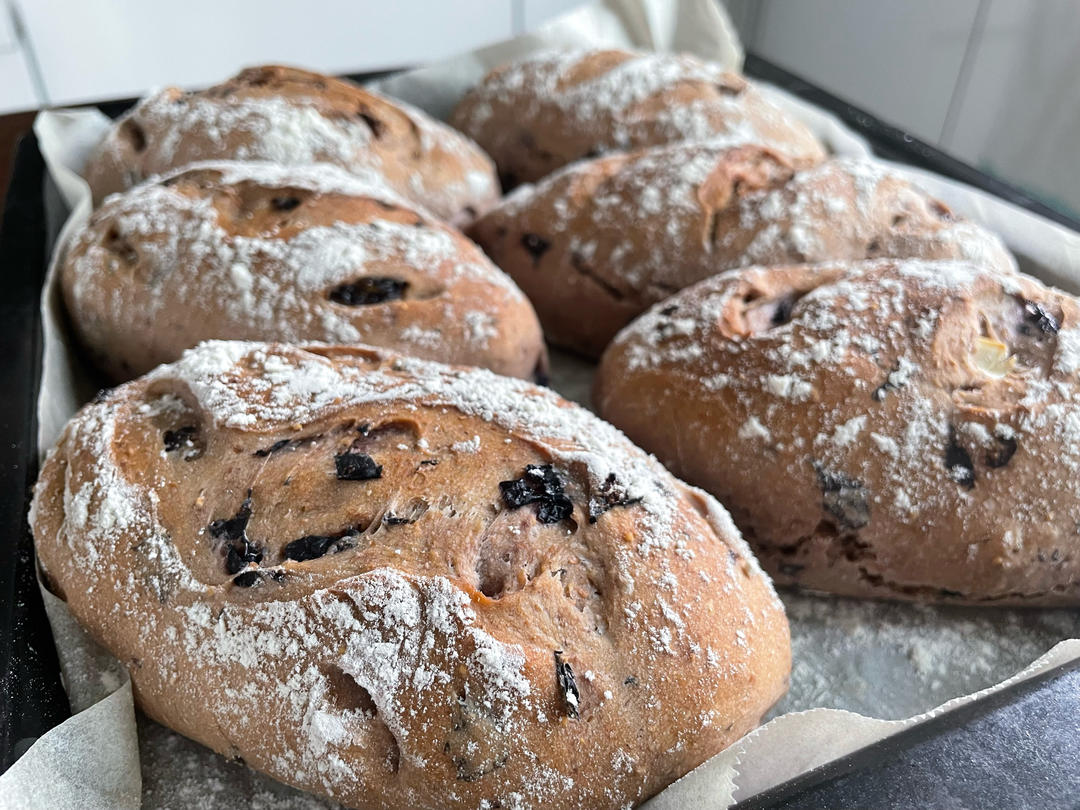 和风走走停停 做过 手揉短法棍 红酒全麦核果包,非常好吃,全麦吃起来也没感觉,红酒浸泡的葡萄干+无花果过滤后还挺湿润,所以前面加的水量还是要看面团状态,没有蒸汽石还是用油纸上喷水的方式制造蒸汽,外壳很脆内里柔软,会一直做的方子。烤箱小做了160g六个,红酒很香,感觉下次可以加点肉桂。 07-20
