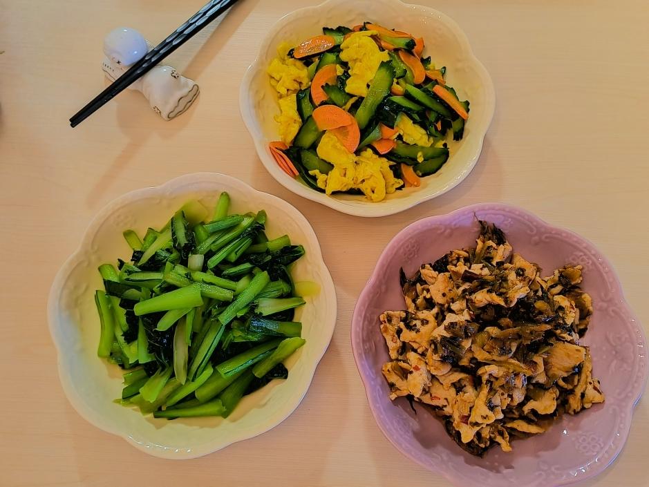黄瓜炒鸡蛋、炒菜心、酸菜炒里脊肉、菠菜汤