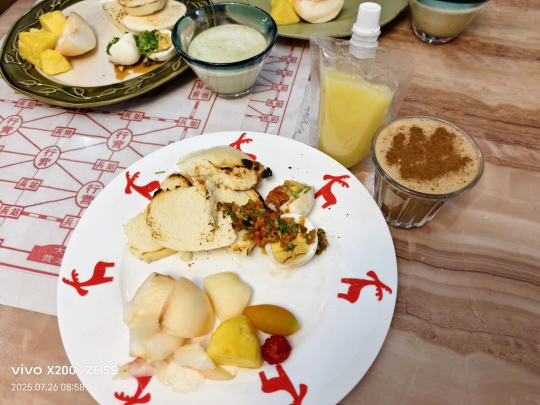 小希小小希妈 做过 早餐•2025年7月26日 #早餐•2025年7月26日# #大宝的清爽晚餐#半个馒头,一个水煮蛋,100克水果,妹妹还有一块煎鱼,孩子们是抹茶牛奶,我的肉桂奶咖和姜柠汁 07-26