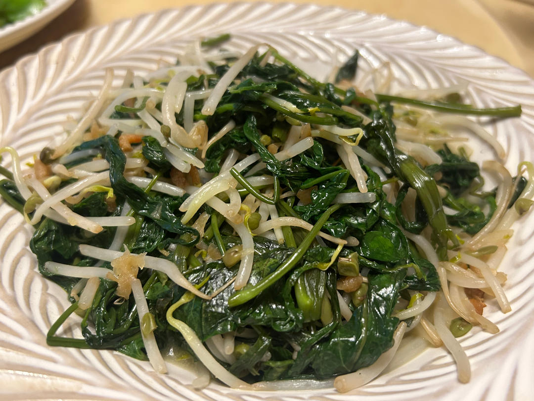 嫩叶炒豆芽,加了虾酱腌萝卜一起炒,很有闽南和南洋地区的风味