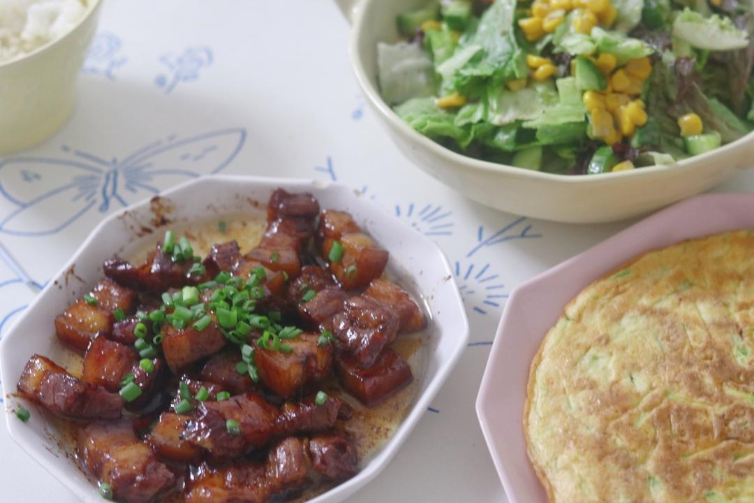 红烧肉,沙拉,西葫芦鸡蛋饼