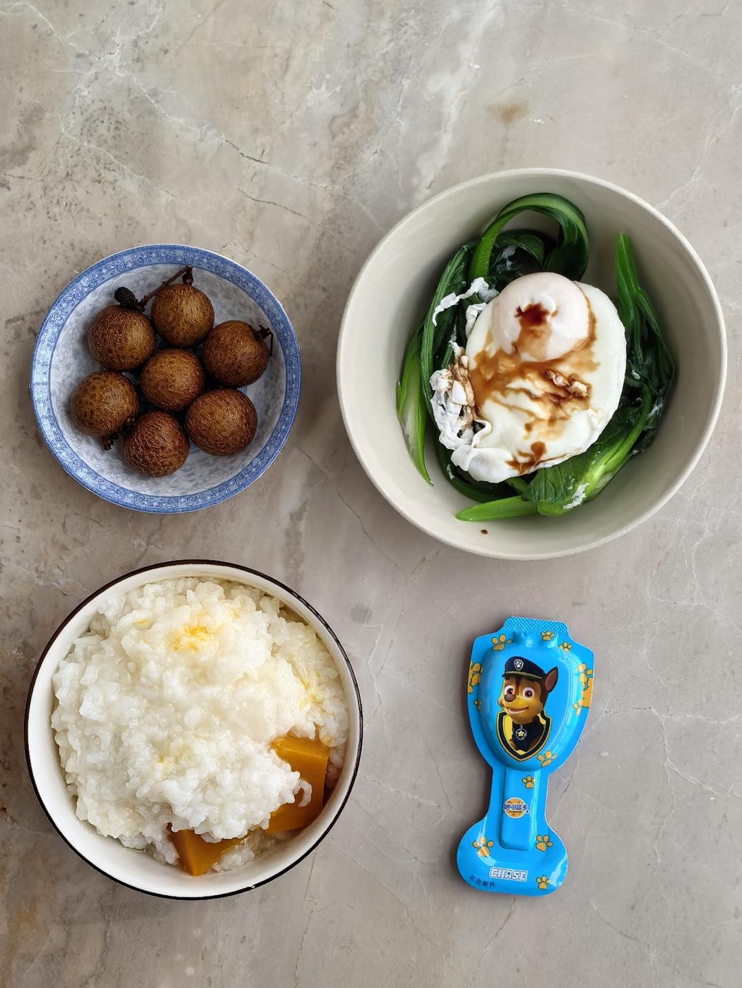 龙眼、酱油鸡蛋菜心、南瓜干稀饭、奶酪棒