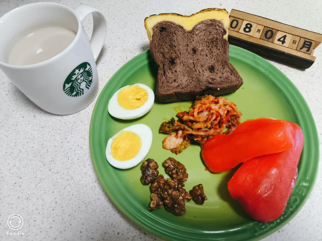 20250804早餐打卡2012:吐司,煮蛋,辣白菜,核桃,彩椒,咖啡。早餐中国;