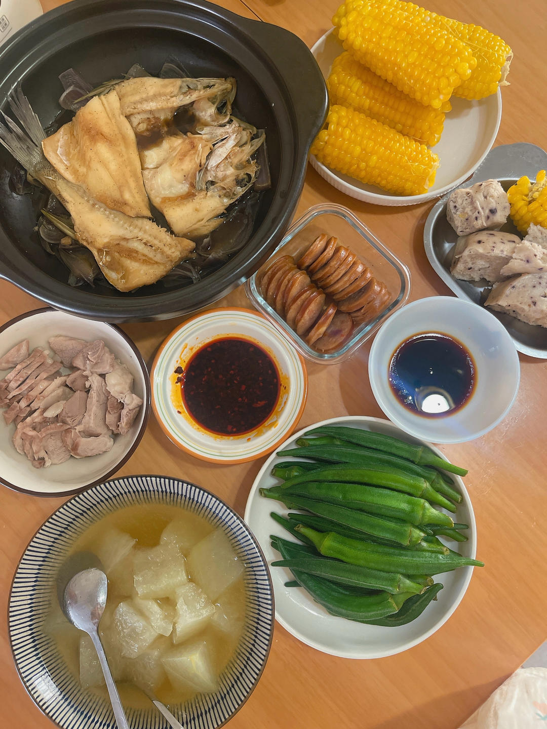蒸鲈鱼、冬瓜汤、秋葵、肉肠、肉片、玉米🌽