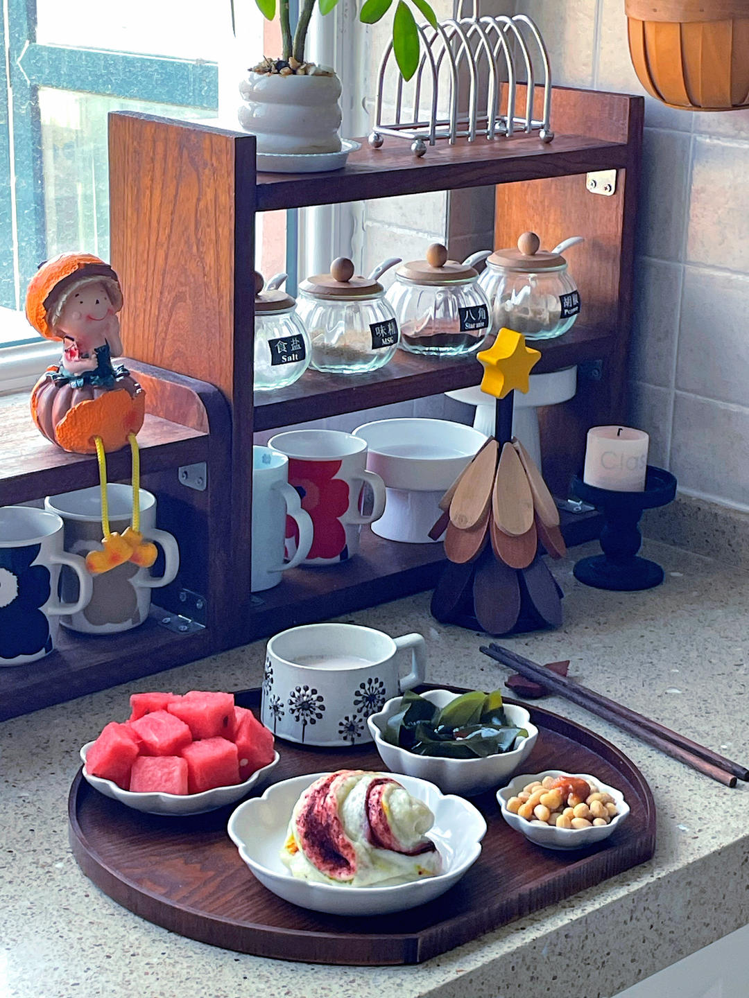 晨光透过玻璃窗时,刚好撞见这些细碎的美好,三色花卷蜷着温柔的弧度,纳豆在碗里冒起治愈的小泡泡,海带结带着清爽的脆响,最后被亚麻籽酥油茶的暖香轻轻裹住,还有冰镇的新疆西瓜🍉