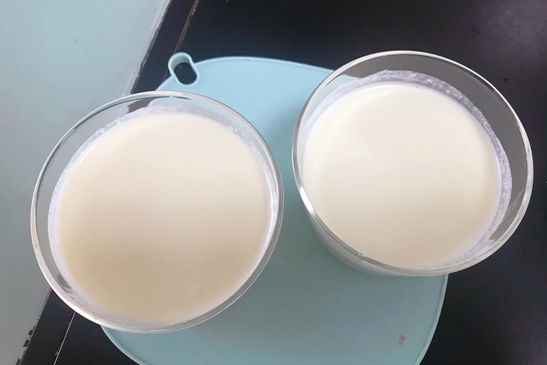 牛奶207.2g,32g白砂糖,盐0.5g,雀巢淡奶油 65 克,矿泉水 60g,大卫吉利丁片4g,柠檬汁2滴,没放酒,用刮刀刮去气泡,做369.4克