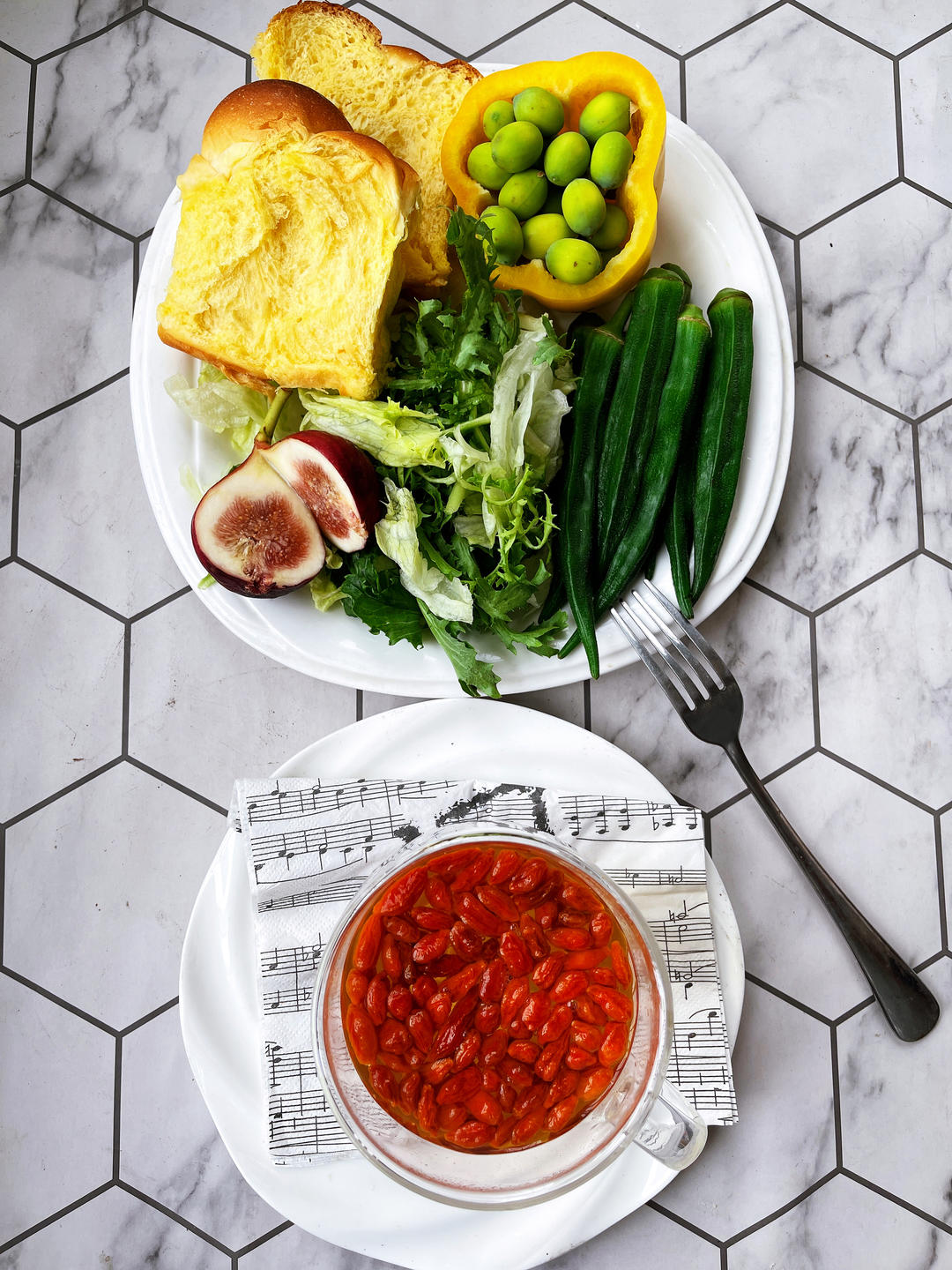 工作日早餐:杂蔬+秋葵+无花果+彩椒+莲子+南瓜老面包+枸杞水。