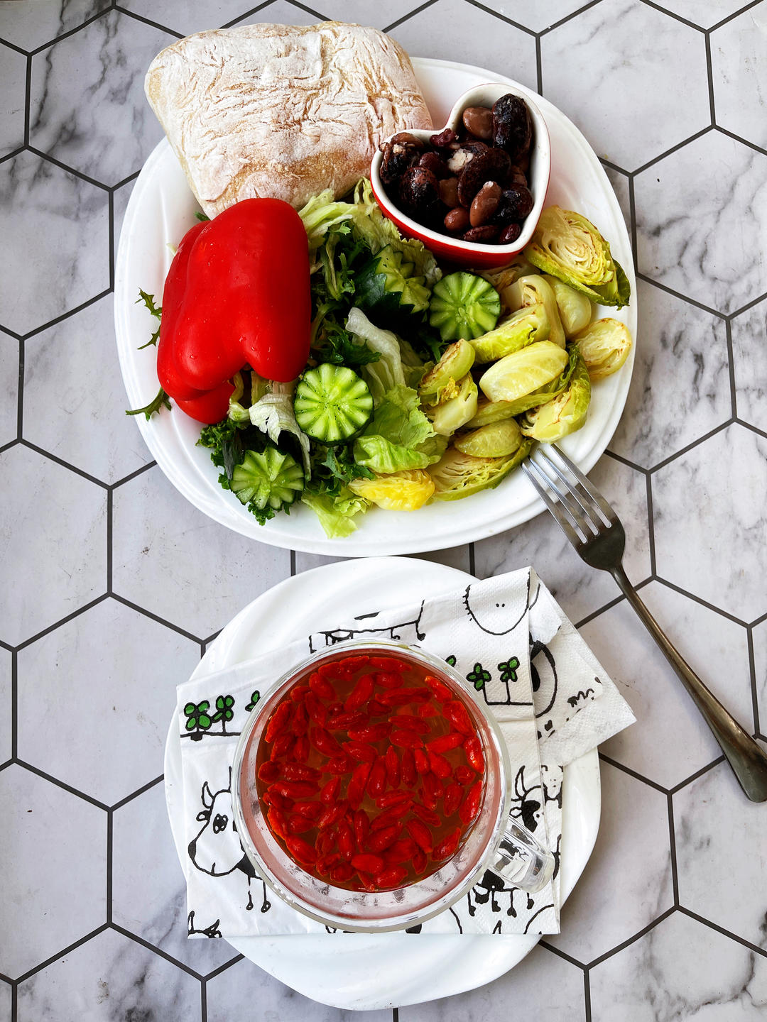 工作日早餐:杂蔬+彩椒+黄瓜+花椰菜心+杂豆+恰巴塔+枸杞水。